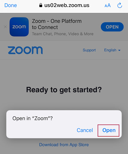 The link will redirect you to a popup browser. If you have the updated version of Zoom, click 'Open' and join the live call.