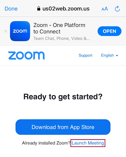 If you don't have the latest version of Zoom on your mobile, you can still proceed by clicking 'Launch Meeting' (and then update your Zoom to the latest version after the call).